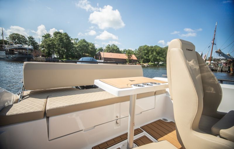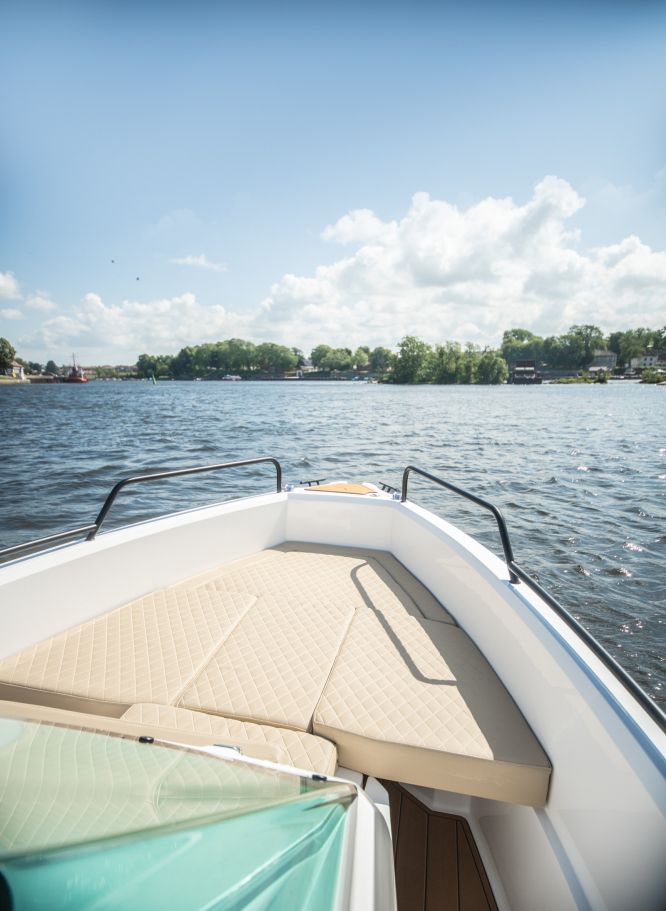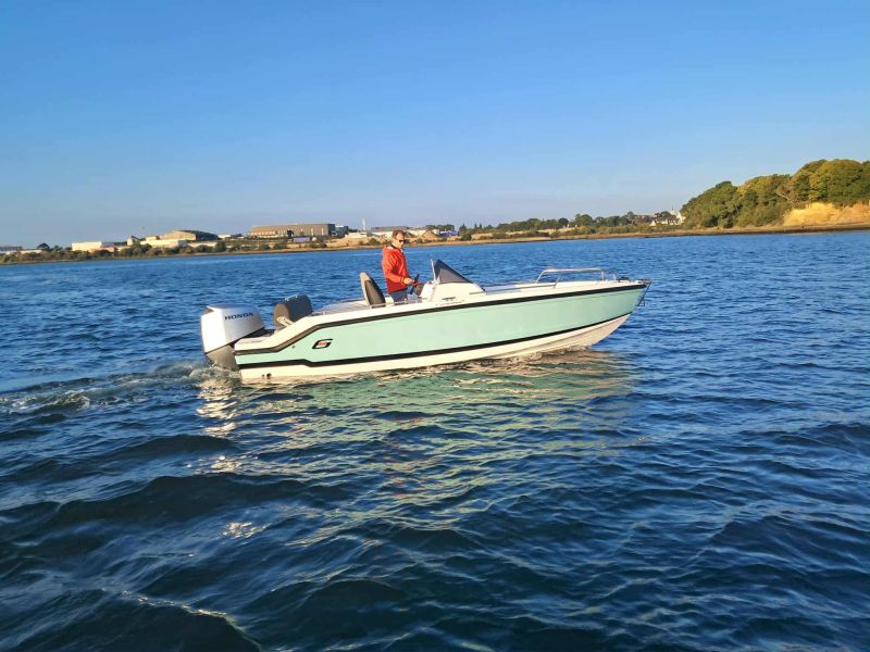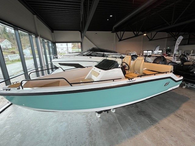 Dotari standard: chila culoare/gelcoat alb, consola centrala cu parbriz, scaune cu sezut rabatabil( pilot/co-pilot), scara retractabila, rola ancora, mana curenta prova+pupa, tacheti set complet de tapiterie, rezervor 130 litri, lumini navigatie, pompa automata de santina 500GPH, priza 12V USB, heblu, instalatie electrica 12V, extensii swimplatform