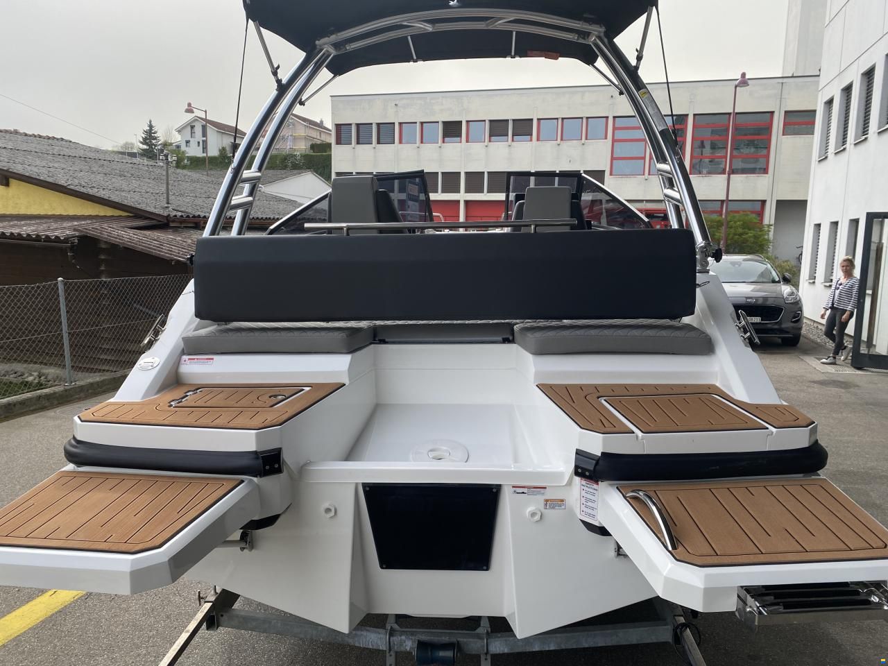 Chila culoare alba, scaun cu sezut rabatabil pilot/co-pilot, parbriz armat cu profil de aluminiu, guvernare hidraulica, scara rabatabila pupa, rola ancora, mana curenta in prova, set complet tapiterie, lumini de navigatie, lumina de ancora, rezervor 190litri, pompa automata de santina, priza 12V USB, heblu, instalatie electrica, dus cockpit/pupa, extensii swimpaltform.